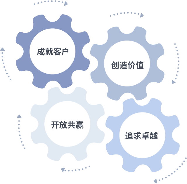 成就客户是一切决策的出发点,,,,创造价值是衡量所有工作的标准,,,追求卓越是我们做事做人的态度,,,,开放共赢是我们的格局也是最终的结果。。。。价值观的齿轮环环相扣,,推动着组织里的每个人不断向前。。。。