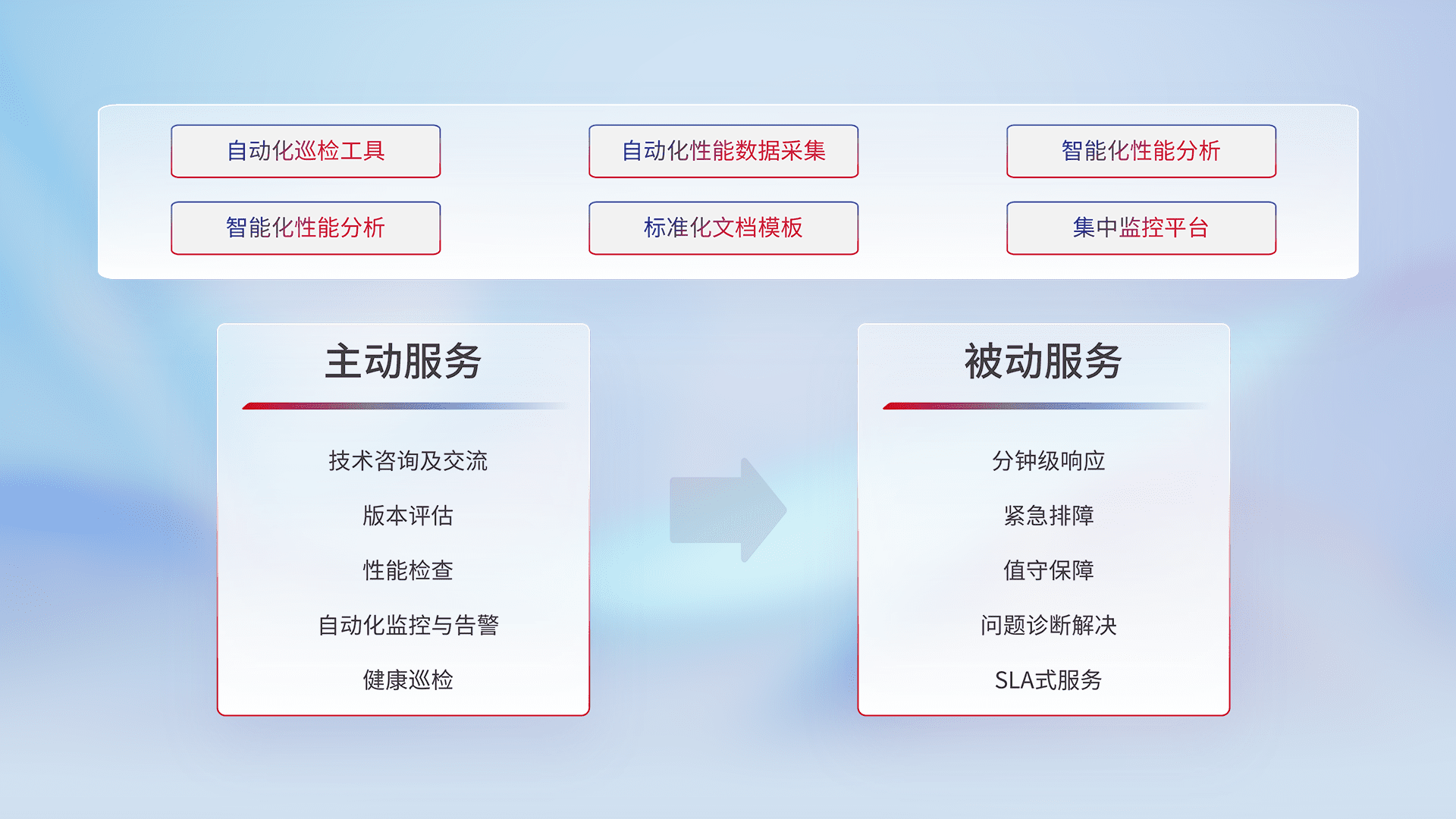 智能化工具和标准化文档,,保障服务质量,,提供主动服务(包含技术咨询、、、、版本评估、、、、性能检查、、、、自动化监控与告警、、、、健康巡检)和被动服务包含(分钟级响应、、紧急排障、、值守保障、、、问题诊断解决、、、、SLA服务)。。